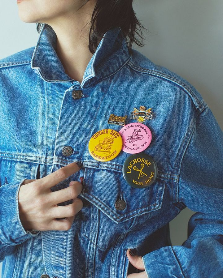 ★デニムジャケット¥16,800、★ピンバッジ各¥500(共にロングビーチ 表参道)、★缶バッジ各¥1,500(全てブドワール)