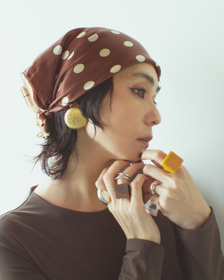 ★スカーフ¥4,000(ベランダ 表参道)、★イヤリング¥7,590(アンバーヴィンテージ)、★右手人差し指リング¥19,800、★右手薬指上リング¥13,200、★右手薬指下リング¥2,200、★左手人差し指リング¥19,800、★左手薬指リング¥15,400、★左手小指リング¥10,450(全てゾハルヴィンテージ)、ボディスーツ¥38,500(ハウズ/エディット フォー ルル)