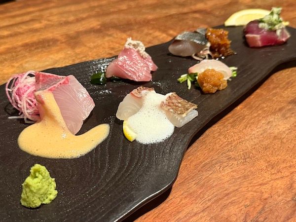 お刺身盛り合わせ(一人前 1,298円) 続いて登場したのは、お店自慢の「お刺身盛り合わせ」。驚くのは、なんと醤油を使わないスタイルです!魚種に合わせて味付けを変えるというこだわりで、泡状のポン酢や醤油が軽やかに香ります。