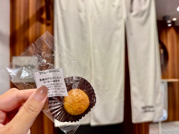 帰り際には、かわいらしい「マドレーヌKUNUくじ」が用意されていました。一口サイズのマドレーヌとともに、小さなくじが入っていて、次回来店時に嬉しい特典が当たります。今回は食後のドリンクサービスが当たりました! 他にもコース一人前無料などの特典もあるそう。最後まで遊び心と温かさに包まれたおもてなしに、自然と笑顔がこぼれます。