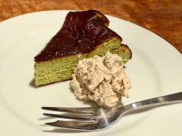 和のスイーツ!抹茶のバスクチーズケーキ(550円) こちらも濃厚なスイーツ。バスクチーズケーキの横には、きなこホイップが添えられています。ひと口食べると、抹茶の深い香りとほろ苦さが広がり、後からふんわりと香ばしいきなこの甘みが追いかけてきます。和の余韻を楽しめるデザートでした。
