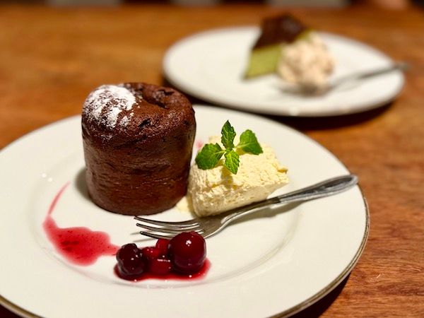 焼きたて!フォンダンショコラ オレンジ風味のムース添え(770円) 迷わず注文したデザートはこちら!運ばれてきた瞬間、カカオの芳醇な香りがふわりと立ち上ります。ショコラの濃厚な甘みとムースの爽やかな酸味が重なり、濃厚さと軽やかさのバランスが絶妙な一皿でした。 また、焼きたてで提供されるため、出来上がりまでに15分ほどかかるそう。デザートを楽しみたい方は、少し早めの注文が安心です。