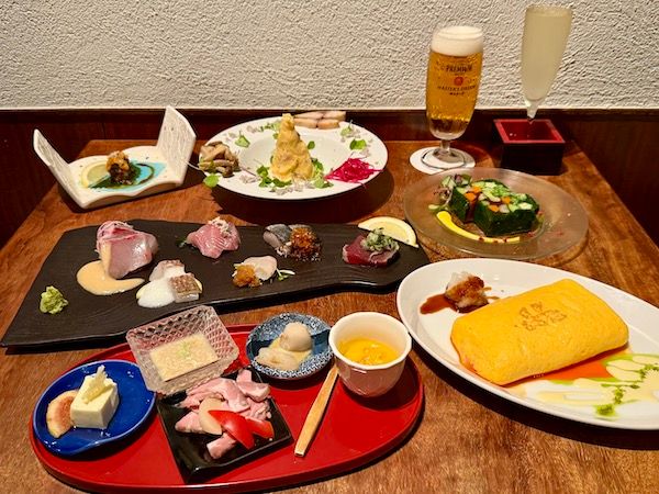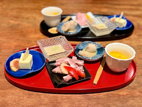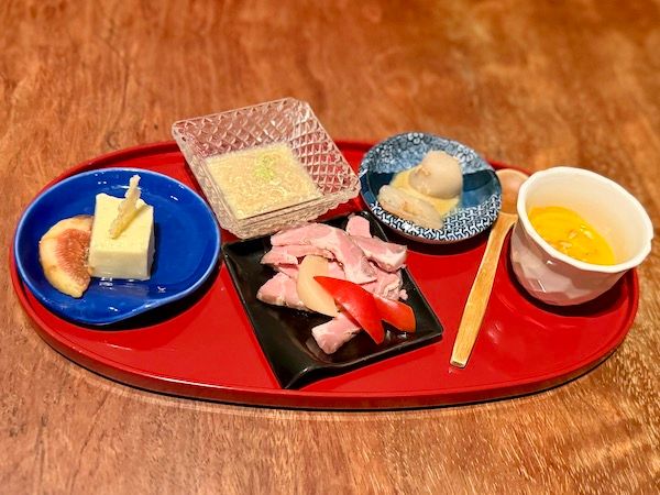 最初に運ばれてきたお通しを見て、思わず「これ、お通しですよね?」と確認したくなるほど。一品ずつ丁寧に盛りつけられた5皿が並び、思わず見惚れるほどの存在感です。最初の一皿で、お店のおもてなしの心が伝わってきます。