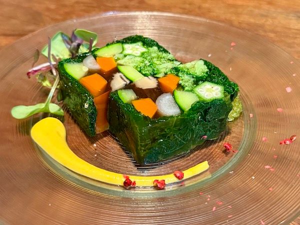 野菜のコンソメゼリー寄せ(968円) オクラやしいたけ、にんじん、ごぼうなど旬の野菜が彩り豊かに並び、フレンチの技法で味わう贅沢なひと皿です。