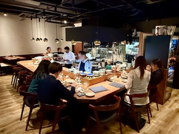 扉を開けると、木のぬくもりを感じる落ち着いた空間が。警固神社のすぐそば、行き交う人が多い天神エリアにありながら、店内は驚くほど穏やかな時間が流れていました。 女性同士やカップルで訪れるお客さんの他、大人数で訪れているお客さんの姿も。カウンターはコの字型に配置され、目の前で料理が仕上がっていくライブ感も魅力です。