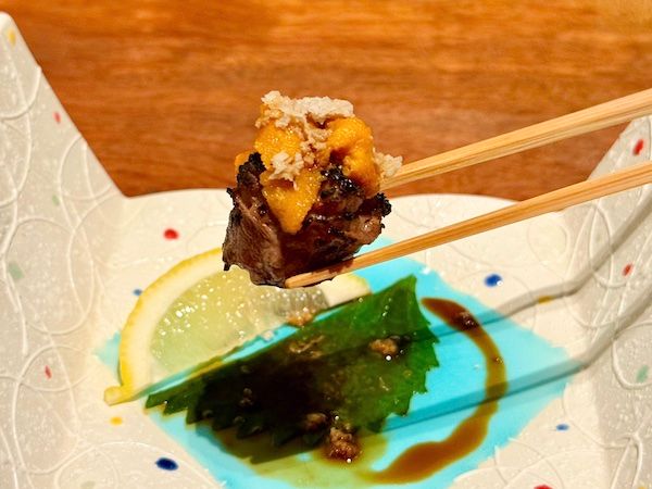 黒毛和牛のウニ巻き(638円) こちらは一口サイズの贅沢。炙った和牛とウニがとろけるように一体となり、思わず目を閉じて味わってしまう美味しさです。