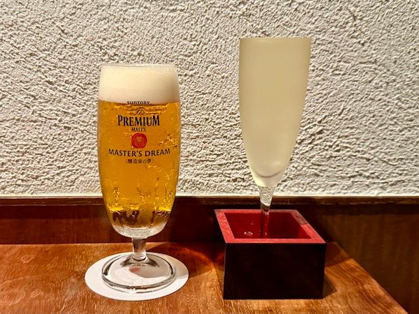 ドリンクは「ザ・プレミアム・モルツ マスターズ・ドリーム」(770円)をチョイス。マスターズ・ドリームを生ビールで味わえるのは貴重で、料理との相性も抜群です! さらに、「ついに復活!!すりきりスパークリング」(550円)は、枡に入れたワイングラスのふちギリギリまでスパークリングを注ぐ粋な一杯。目でも楽しめる演出に、会話が弾みます。 (※表記価格は全て税込です。)