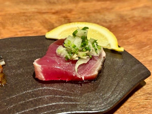 この日の盛り合わせは、本鰹やヒラメなど6種類。組み合わせる薬味やソースがどれもひと工夫されていて、新しさを感じる一皿です。中でも印象的だったのは本鰹。にら醤油が香り高く、旨みをいっそう引き立てていました。