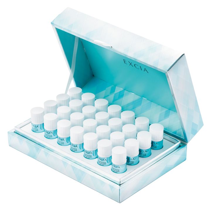 「進化するたび肌が変わる感動をくれる。その最新も、美白有効成分のコウジ酸も、実際に目にする肌の明るさも、可能性の広がりを実感。ツヤやハリがみるみる育っていくようでマルチなエイジングケアとしても」。エクシア ブライトニング イマキュレート セラム Z[医薬部外品]1.5ml×28個 ¥27,500(アルビオン)
