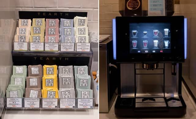 「 TEARTH(ティーアース)」のティーバッグは、紅茶や日本茶、ハーブティーなど10種類。コーヒーマシンにはブレンドやエスプレッソ、ホットとアイスのカフェラテや、バンホーテンのココアもありました。