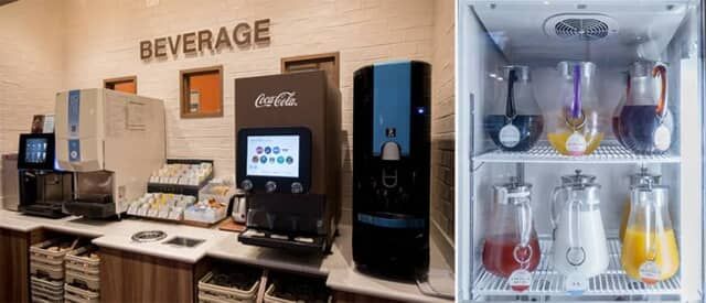 ソフトドリンクやコーヒー、紅茶も種類が豊富。常に冷蔵庫で冷やされているアイスコーヒーや牛乳のほか、オレンジジュースやトマトジュース、季節限定のピーチパインなどプラスアルファの味を楽しめます。