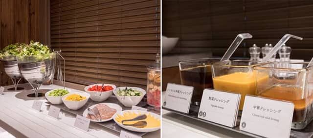 フレッシュなミックスサラダやコーン、枝豆、ミニトマトなどのほか、イタリアンソーセージやチェダーチーズなどを用意。オリーブオイルや塩、胡椒をそろえるほか、ドレッシングは日替わりで3種類。この日はノンオイル和風ドレッシング、野菜ドレッシング、中華ドレッシングでした。