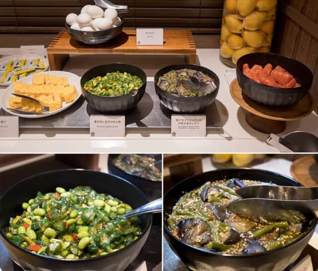 このほか洋食や和食も用意され、好みにあわせてバランスよく食事をできるのも高ポイント。クリスピーベーコンやソーセージ、スクランブルエッグなど、ホテル定番のメニューに加え、和食のお惣菜も並びます。