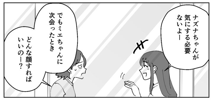冷静に分析できるアイコちゃんはすごいなと思いました……。ミエちゃんとのやりとりを思い出し、私は恥ずかしさと気まずさで心がいっぱいになりました。アイコちゃんはなんだかおもしろそうにその様子を見ています。