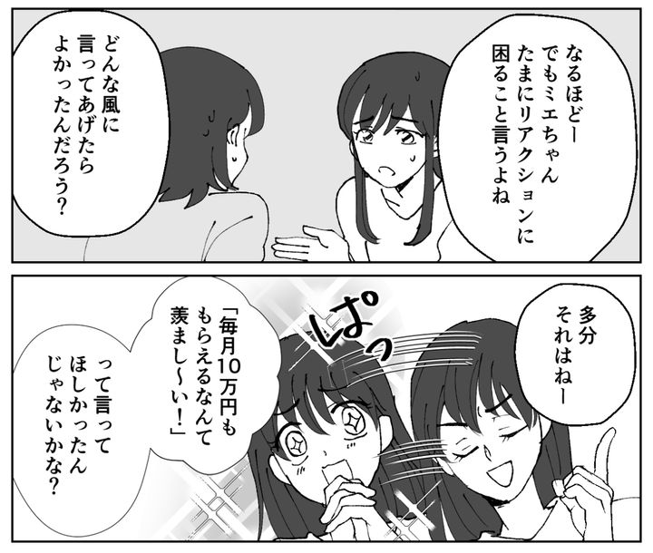 アイコちゃんは、「毎月10万円ももらえるなんて羨ましいって言ってほしかったんじゃないかな?」と言いました。