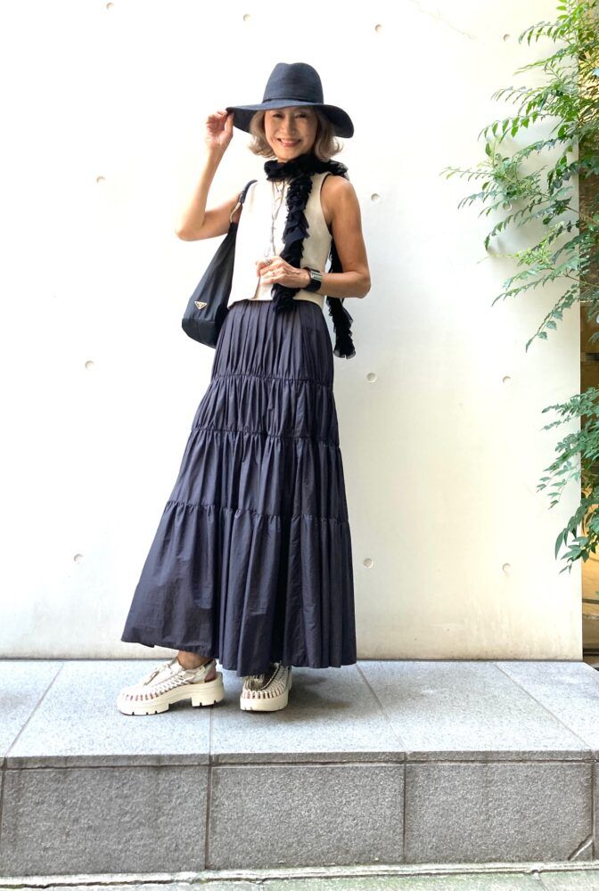 つば広ハットとボリューミーなスカートの組み合わせがとっても素敵なスタイリング。でもそれは、トップスの素材やデザイン、サンダルなど、組み合わせによるものなのだとわかり、さすが!と思いました。