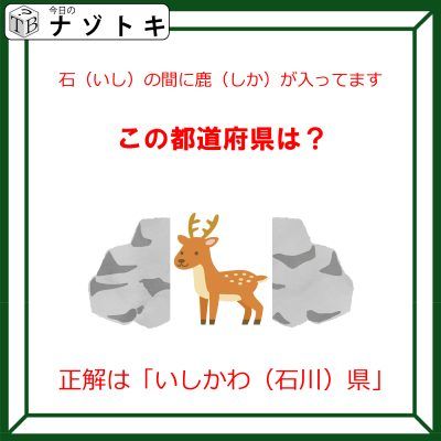 つまり、岩を均等に割って真ん中に鹿がいることになります。これを言葉で考えてみると「いわ」の中に「しか」がいるということになります。なので、いわの中にしかをいれていきましょう。そうすると「いしかわ」になります。
