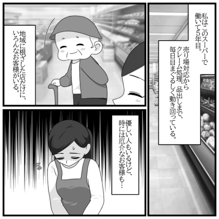 主人公のスーパーで働くアラサー女子。優しい人も多い中、やはり迷惑なお客さんも結構いるようで・・・。