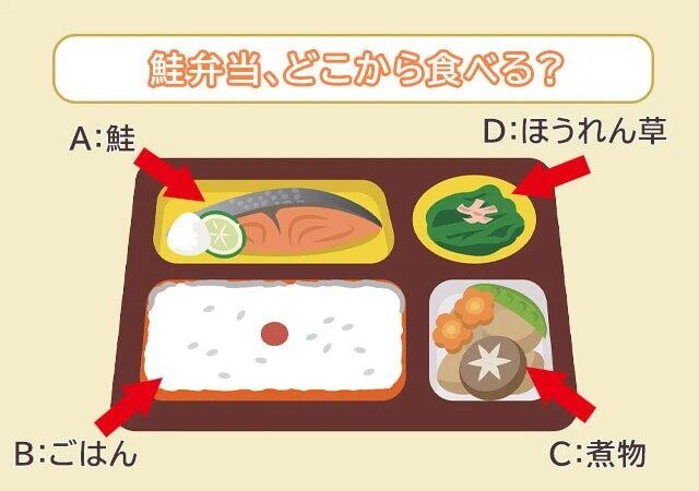 食事の仕方には、その人の本性があらわれます。あなたが気づいていない自分があらわになるのです。あなたがこの鮭弁当のどれを最初に食べたいと思ったのかから、「今の自分への不満」が明らかになります。