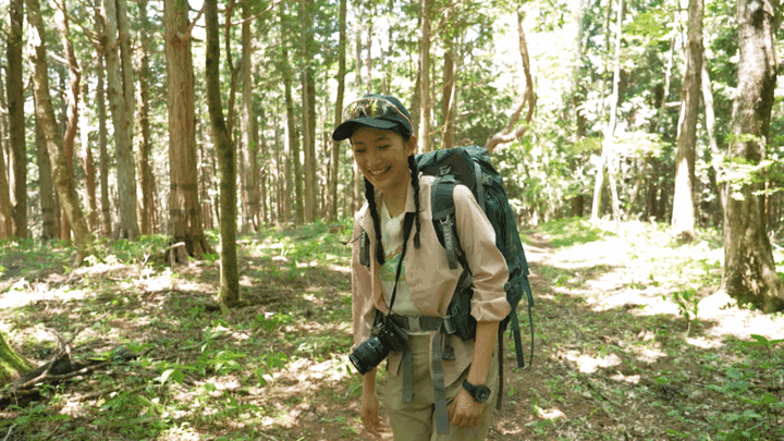 木漏れ日の降り注ぐ林道に入ってほどなく、何かが撮影隊の目の前を横切ります。「鹿です!鹿が出迎えてくれました」と野口さん。大自然に囲まれていることを実感しながらさらに先へ進みます。別荘地を抜けていよいよ本格的に登山道へ。始まりは階段から。「この階段が疲れるんですよねぇ。でも、最初は階段から始まるんですよ、どの山も」とぼやく野口さん。「ヒマラヤとかに登る野口さんでも疲れるんですか?」と尋ねるスタッフに「それは疲れますよ、人間なんで」と照れ笑い。でも疲れたその先に何倍もの感動が待っているのが山の醍醐味、ですよね?