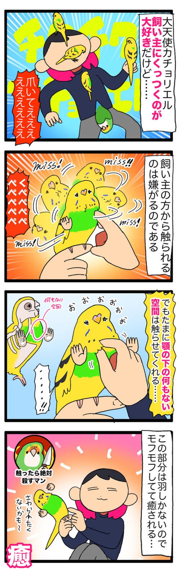 絵を描く仕事をしながら、鳥専門のペットショップで働いてるえるぽぴさん。インコへの愛情あふれるエピソードを絵日記で配信しています。ここでは、「我が家のインコたちのはなし」から『大天使カチョリエル』のエピソードを第1話から順にご紹介します。