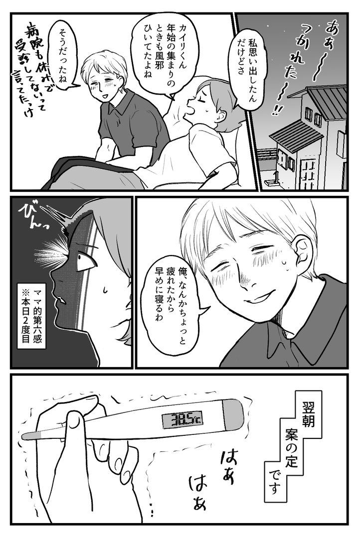 旅行の前日、夫は「少し疲れたみたい」と言って、いつもより早く寝ました。翌日は家族旅行の予定だったので、体調を整えようとしていたのだと思います。ところが翌朝、顔色が悪く、ぐったりしている様子でした……。体温を測ってみると、38.5℃の高熱。咳も出ていて、とてもつらそうでした……。
