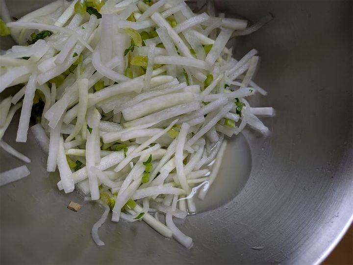 5分後の様子がこちら。水分が出てきて大根がしんなりとしています。