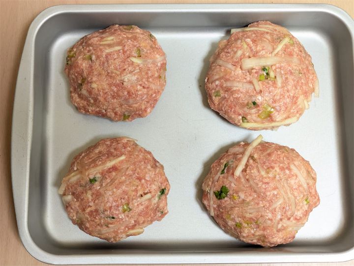 2. 1に合いびき肉と[A]を入れてよく混ぜる。4等分にして形を整える。