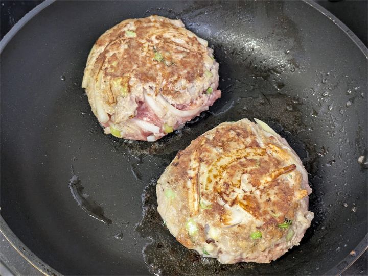 ハンバーグに厚みがあるので、中まで火が通りづらいかもしれません。そんなときは、片面を焼いたあとに少量の水を加えてフタをし、5分ほど蒸し焼きにするとよいですよ!