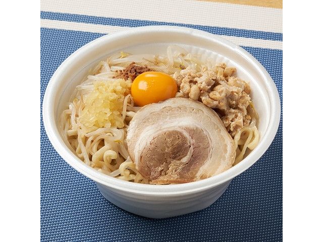 「頑者」監修の温かいまぜそばです。弾力感ある太麺ちぢれ麺に、魚粉とにんにくをきかせた醤油ダレがよく絡む、ガッツリとした食べ応えに仕上げました。