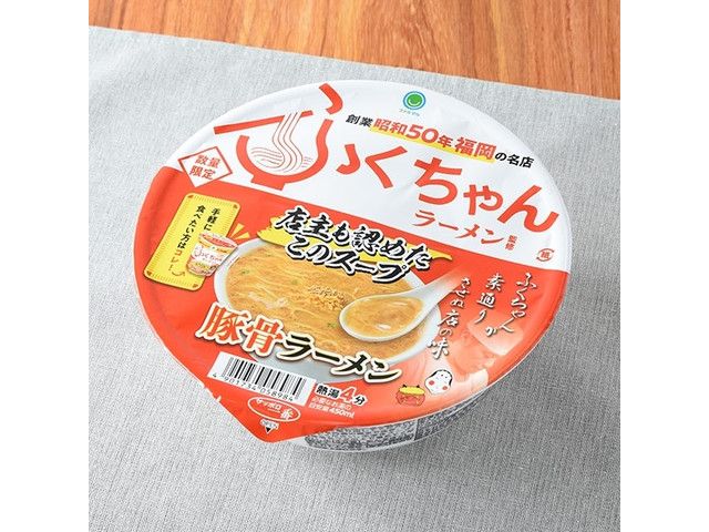 福岡の名店「ふくちゃんラーメン」監修の豚骨ラーメンです。しなやかさがありつつも、しっかりとした食感で食べ応えのある細麺に、豚骨の香りに、醤油の甘さとキレを加えた、濃厚にみえて飲みやすいスープが特徴の豚骨ラーメンです。 [数量限定]