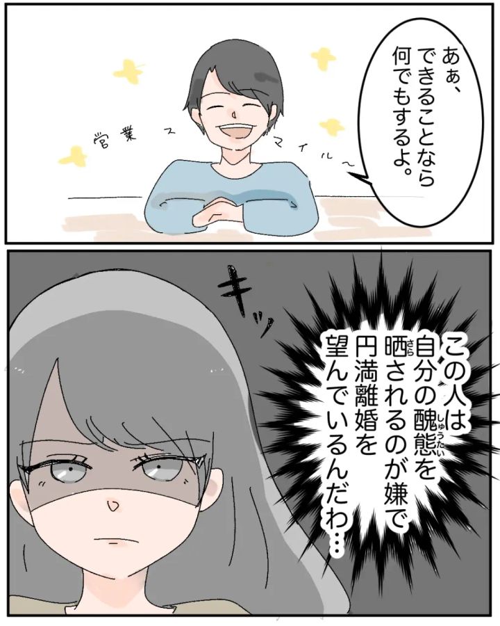不倫相手との間にできた子どもがもうすぐ産まれるから離婚して欲しいと一方的にカオルさんに告げたつかささんは、一週間後に義母とともに離婚届を取りにカオルさんの元を訪れました。カオルさんに拒否権など無いといった態度で離婚の話を進める二人にカオルさんが「条件は私が全部決めていいんですよね?」と聞くと、つかささんは取り繕った笑顔で「できることなら何でもするよ」と言いました。そんなツカサさんを見て自分の醜態を晒されるのが嫌で円満離婚を望んでいるのだろうと感じたカオルさんは静かに怒りが湧いてきました。