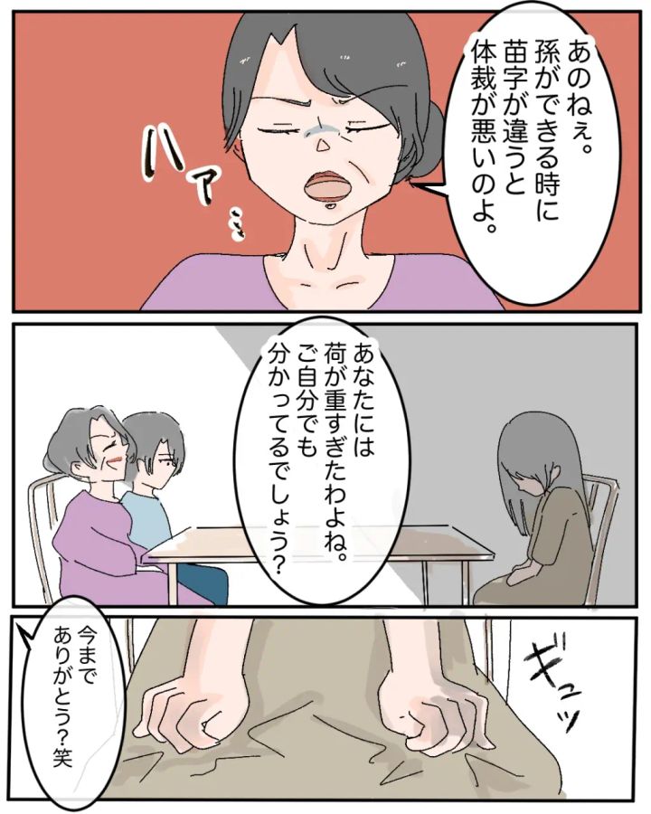 私はつかさと義母と向かい合う形で席につきました。義母は溜息をつきながら「あのねぇ、孫ができる時に苗字が違うと体裁が悪いのよ」と離婚を急かし、「あなたには荷が重すぎたわよね。ご自分でも分かってるでしょう?今までありがとう」と笑いながら言いました。もうすぐ産まれる跡取りのことで頭がいっぱいの義母にとって私は邪魔な存在でしかないようです。私は何も言い返せず黙ってギュッと手を握りしめました。