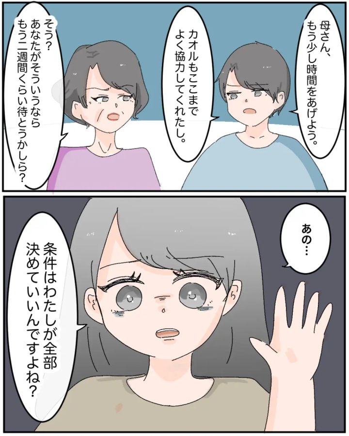 すると、つかさが「母さん、もう少し時間をあげよう。カオルもここまでよく協力してくれたし」と私を気遣うように言い、「そう?あなたがそういうならもう二週間くらい待とうかしら?」と義母。私の意見など全く聞かずに話を進める二人に「あの・・条件はわたしが全部決めていいんですよね?」と切り出した私。
