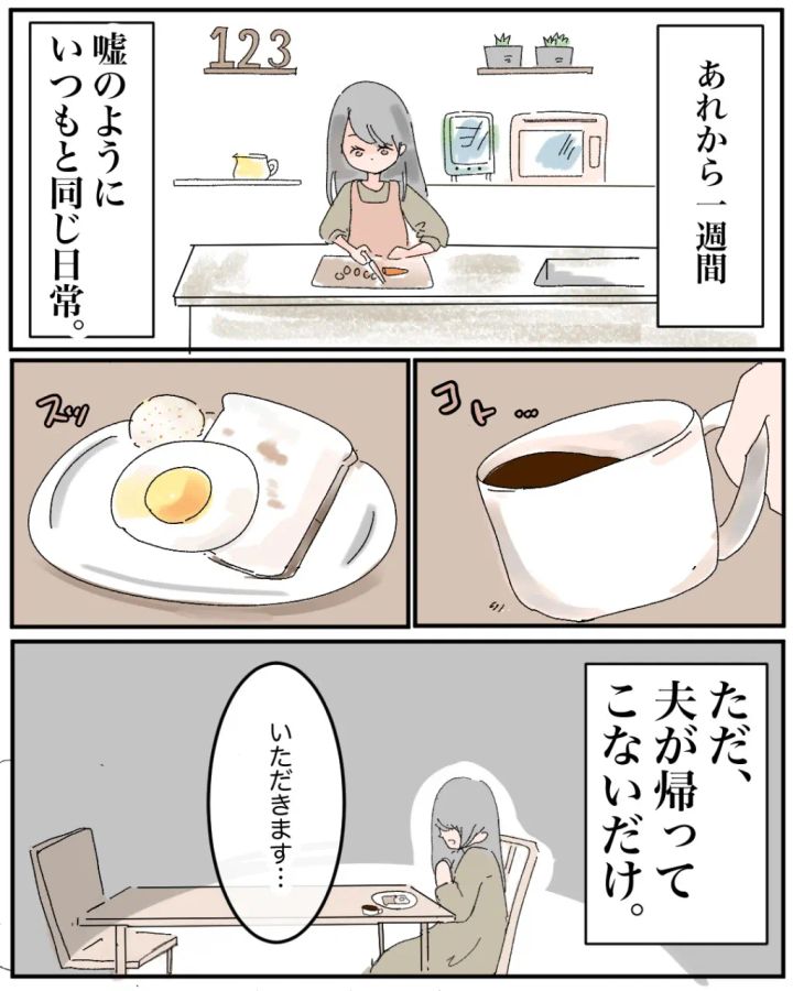 つかさから一方的に離婚を切り出されてから一週間。私は朝食を食べ、仕事に行き、帰ってきて寝る・・という今までと変わらない毎日を過ごしていました。ただひとつ違うのは、つかさが家に帰って来ないということだけ。つかさは妊娠中の女性と一緒に義実家で生活しています。