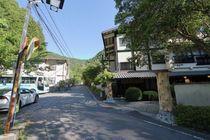 温泉街の入口あたる駐車場やバス停からは緩やかな登り坂となっており、プロムナードコースまでは徒歩で8分ほど。