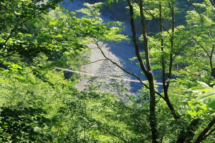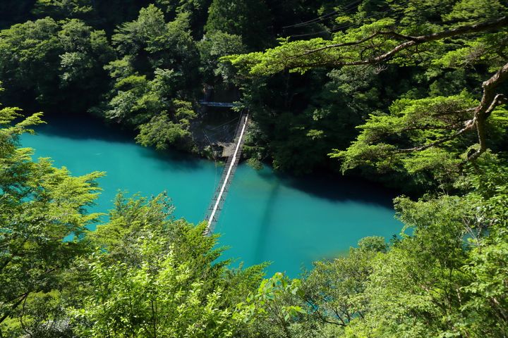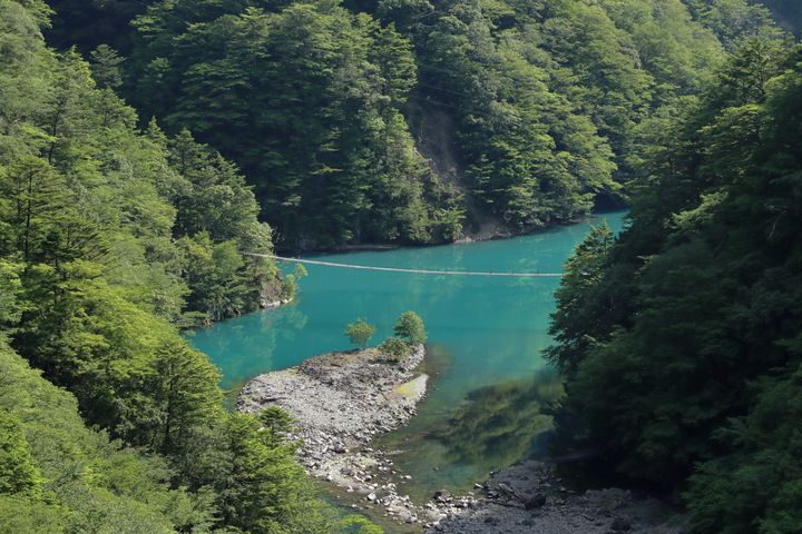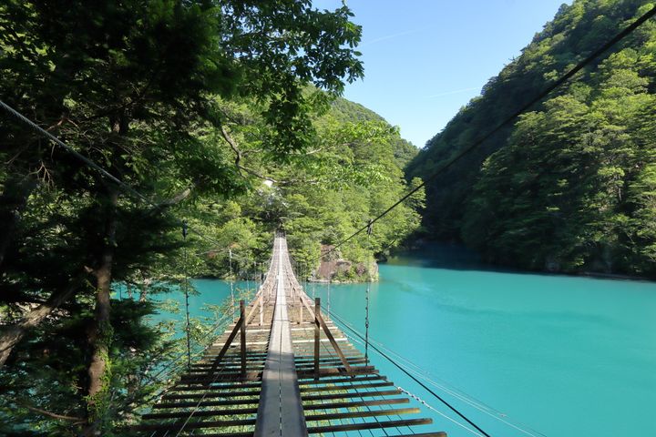 歩き始めて約30分で、夢のつり橋に到着! ターコイズブルーに似た神秘的な色の寸又川に架かる、長さ90mの吊り橋です。