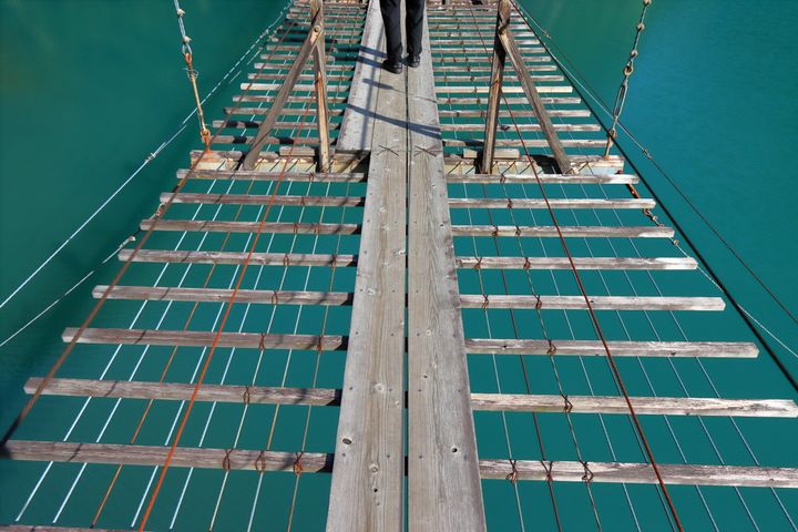 夢のつり橋の足場は、板が2枚あるのみ。橋を吊るワイヤーも細く、歩くたびに揺れるのでとてもスリリング。スマートフォンやカメラを落とさないように気をつけて!