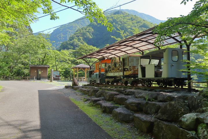寸又峡温泉入口のバス停。かつてこの地を走っていた森林鉄道のトロッコ列車が展示されている