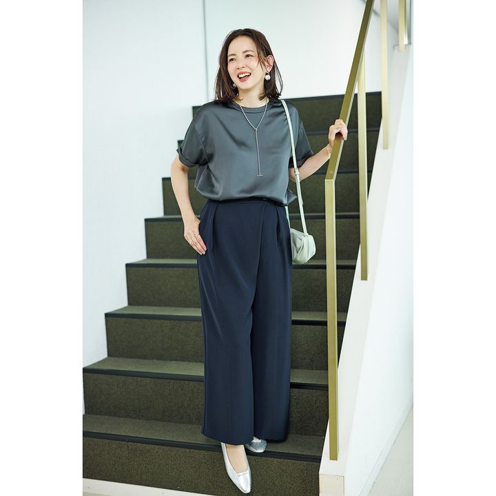 サテンTブラウス¥8,800(Emma Taylor/STYLEDOORE)ラップパンツ¥8,990(アンフィーロ)バッグ¥5,390(カシュカシュ/アンビリオン)フラットパンプス¥11,550(アルテミス by ダイアナ/アルテミス by ダイアナ アーバンドック ららぽーと豊洲店)ピアス¥3,850〈Filigran〉リング[人差し指]¥15,400〈tsugumi iwamoto〉(ともにロードス)ネックレス¥31,900ブレスレット¥4,950リング[薬指]¥12,100(すべてココシュニック オンキッチュ/ココシュニック)