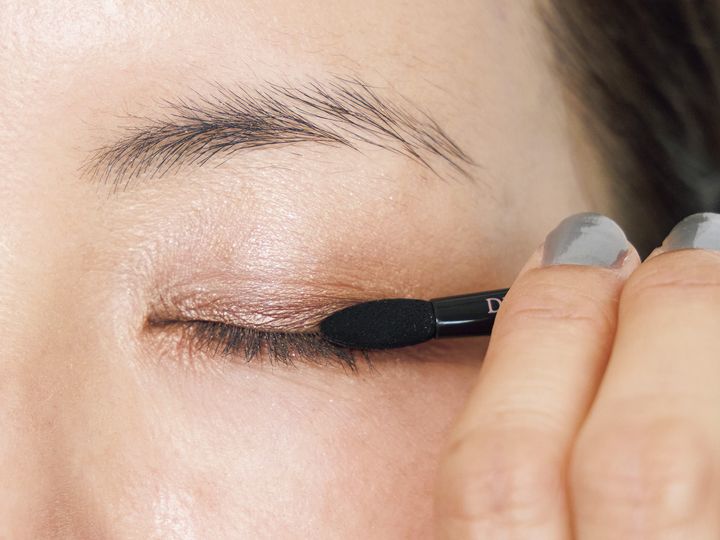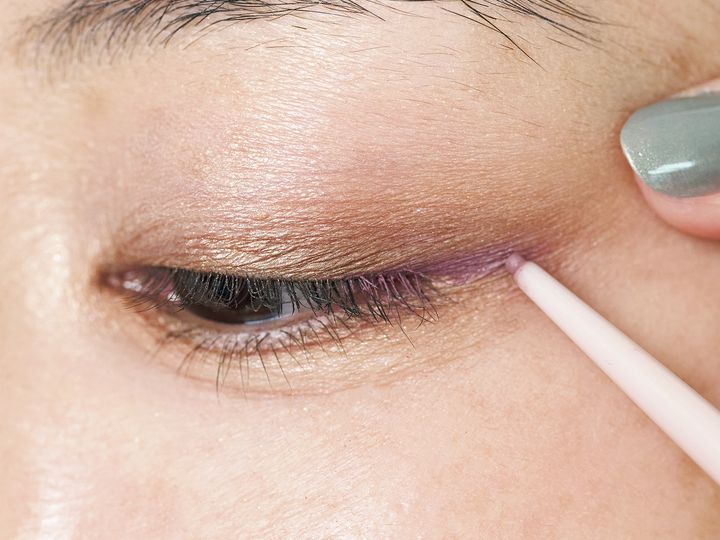 目尻のラインは大注目のスモーキーピンクを。グレーみのあるピンクを目尻に少しだけプラスすることで、ほどよい陰影をつけて引き締めながらも今っぽさも。目尻から5mmはみ出すように描くのがコツです。濃い色1色でラインを目立たせないことで優しい印象の目元が叶うだけでなく、古く見えることを回避します。