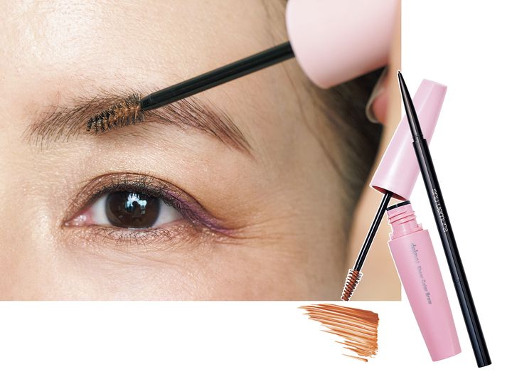 左、元の眉がそのまま色づいた感じの仕上がりに。デジャヴュ シアーカラーグロウ シアーベージュ ¥990※9/19発売(イミュ)右、眉マスカラに似た色をセレクトして。赤みの少ない色なら肌から浮く心配なし。ニードル ブロー ウォルナットブラウン ¥6,160※限定色(シュウ ウエムラ)