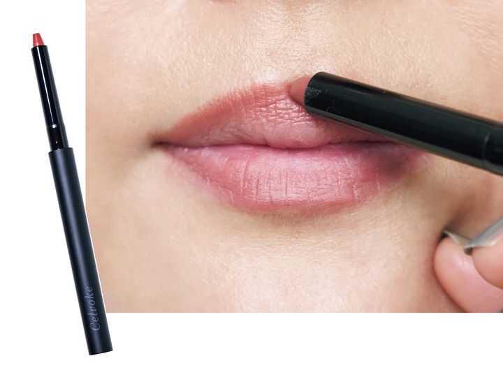 まずはリップライナーで上唇の山を平らにします。これだけでもふっくらとした唇を演出できますが、さらに唇全体の輪郭をなぞることで唇の立体感がUPします。