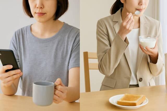 ▲スマホを見ながらコーヒーだけで済ませる女性と、ヨーグルトとトーストで朝食をとる女性。一見ささいな違いに見えても、1日の代謝や集中力には大きな差が生まれます