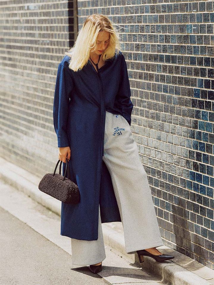 【POINT】深みのあるダークブルーでおおい、スエットパンツをおでかけ仕様に。なだらかな曲線を描くウエストラインはうもれさせずすっきりとした見た目を実現。