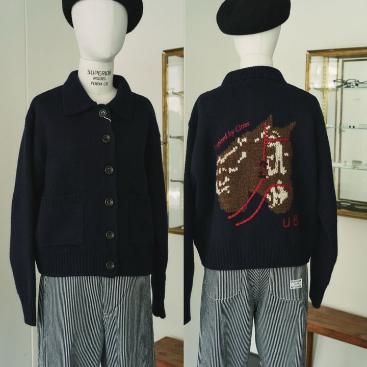 バックに馬の姿を編み込んだカーディガンは、ヴィンテージのようなムードも漂うルックス。襟付き&ボタン仕様の前立てなのでブルゾンっぽく着こなすこともでき、襟はボタンを留めるとスタンドカラーにもなって2通りの表情が楽しめるのもポイントです。