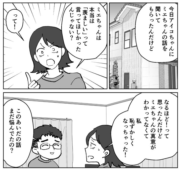 私はナズナ。ミエちゃんを怒らせて数日後、アイコちゃんがお茶に誘ってくれました。そしてどうして怒らせたのかさっぱりだった私に、まさかの真相を教えてくれたのです。アイコちゃん曰く、ミエちゃんは「すごい」「羨ましい」と言ってほしかったのだそう。まったく気づきませんでした……。ただ、いつものミエちゃんの様子を考えると、ありえる話です。自分の鈍感さに恥ずかしくなりましたが、アイコちゃんはミエちゃんの態度もどうかと思うと励ましてくれました。お金の話ってデリケートですし、本当に難しいですね……。