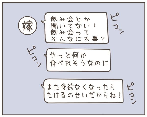 本格的につわりが始まり、つらそうな妻に夫がゼリーを差し出すと、「今日のお昼、ラーメン食べた?」と聞かれる。夫は匂いがよくなかったのかと考えるが、妻は「いいなあ、自分だけ好きなもの食べられて」とつぶやく。