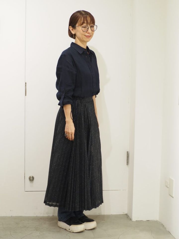 表参道・原宿エリアでギャラリーを運営している珠実さん。「展示期間中は作品の雰囲気を壊さないよう、ベーシックな色をまとうようにしています」。この日は「ラルフローレン」のリネンシャツに濃紺のデニム、「トーガ」の透け感のあるプリーツを重ねて装いをアップデート。ラメがかったスカートがコーディネートに新鮮な抜け感をもたらしてくれるそう。