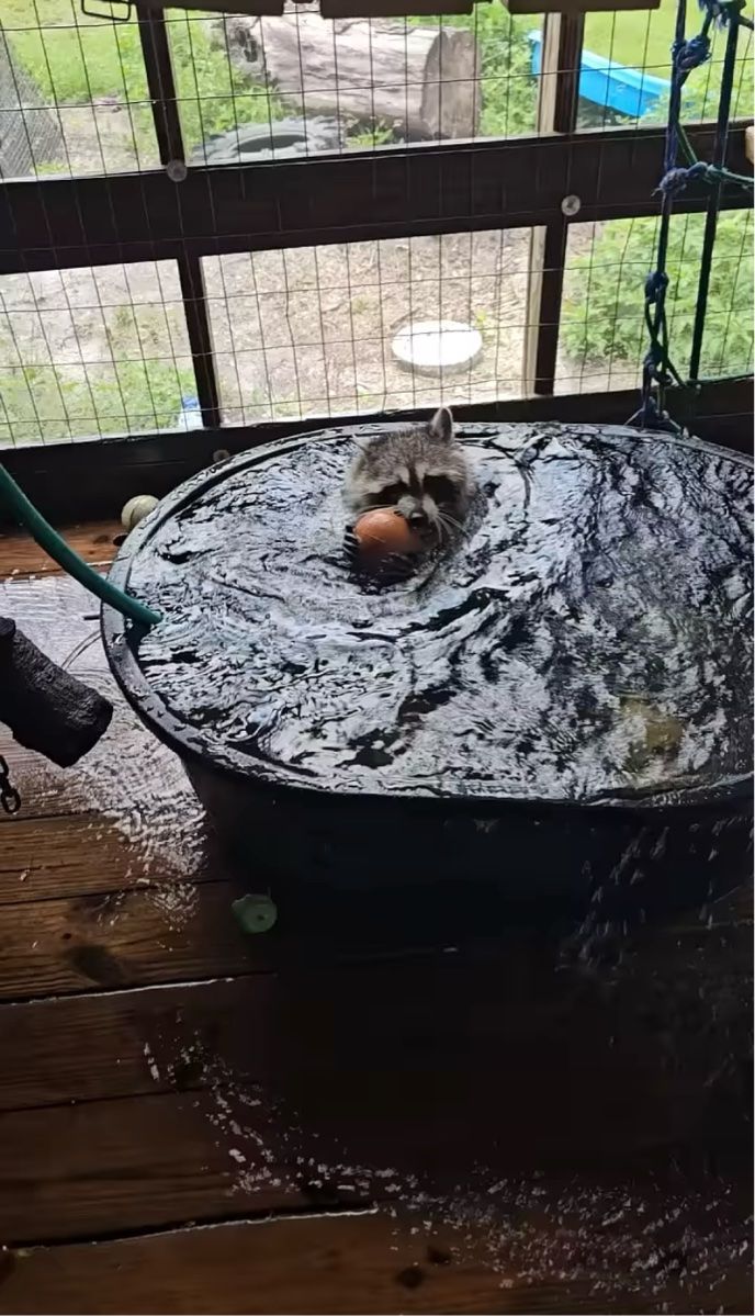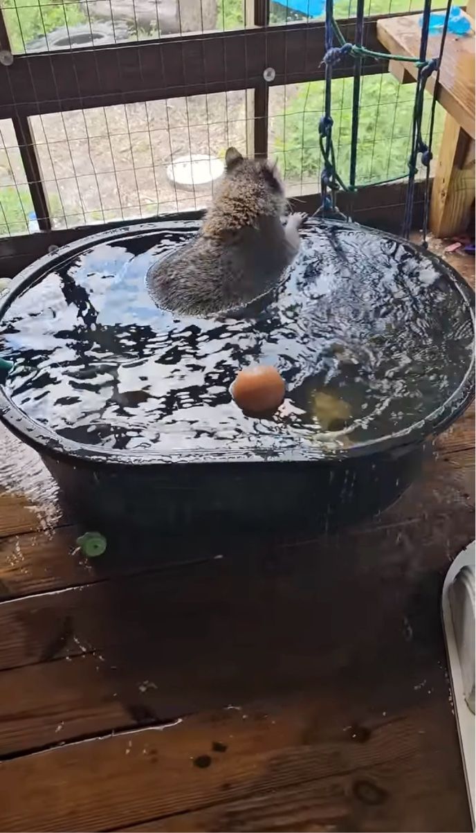 アライグマのバスタイム!遊んではしゃいで満喫中!【海外・動画】